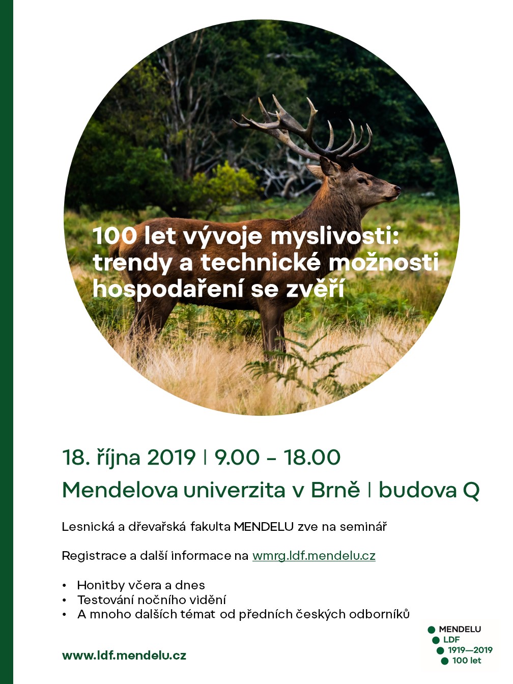 Česká lesnická společnost, z.s., Lesnická a dřevařská fakulta MENDELU, VENATOR, společnost pro zvěř a krajinu, z.s. a Českomoravská myslivecká jednota, z.s. Vás u příležitosti 100. výročí založení Mendelovy univerzity v Brně zvou na odborný myslivecký seminář "100 let vývoje v myslivosti: Trendy a technické možnosti hospodaření se zvěří".
